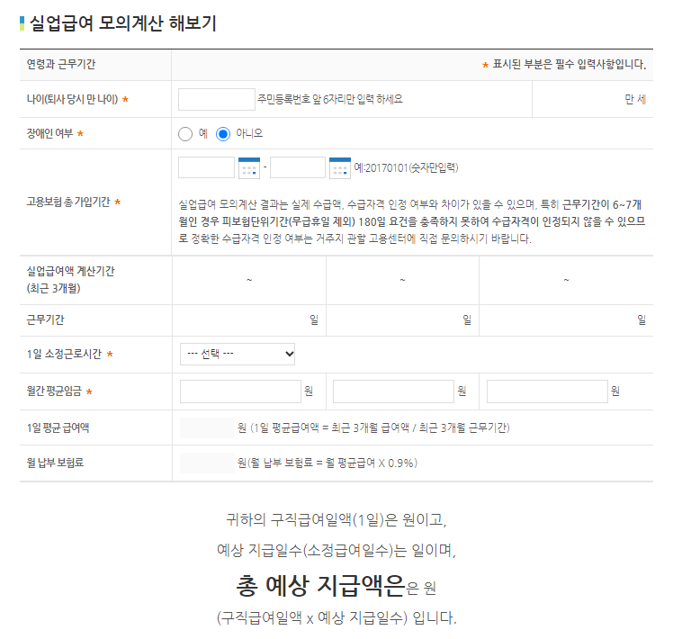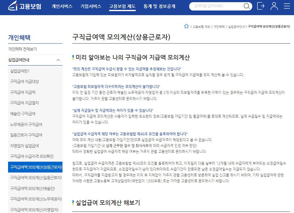 고용보험 홈페이지 > 고용보험제도> 구직급여액 모의계산(상용근로자)에 들어가시면 아래 화면처럼 구직급여액 모의계산을 할 수 있습니다.